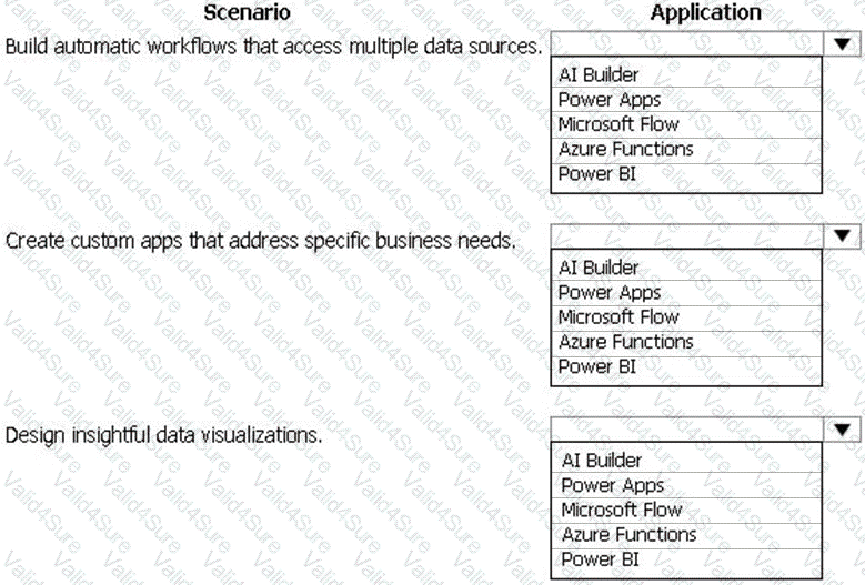 Which Power Platform features should you recommend? To answer, drag the appropriate features to the correct requirements. Each feature may be used once, more than once, or not at all. You may need to drag the split bar between panes or scroll to view content.