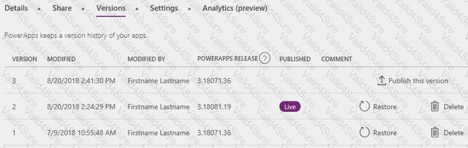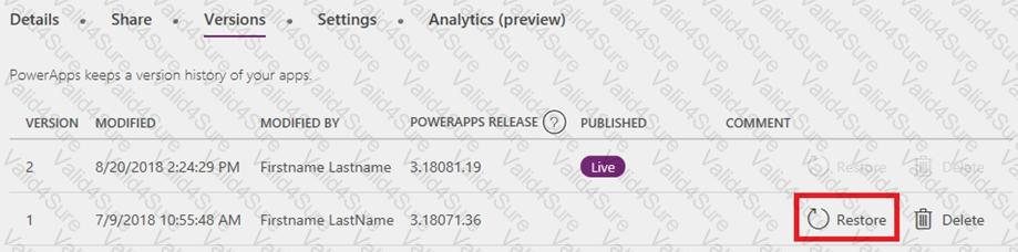 You have a Power Apps app. You create a new version of the app and then publish the new version. A customer goes through the process of restoring the previous version of the app. In the Version tab for the app, you will see two versions of the app.