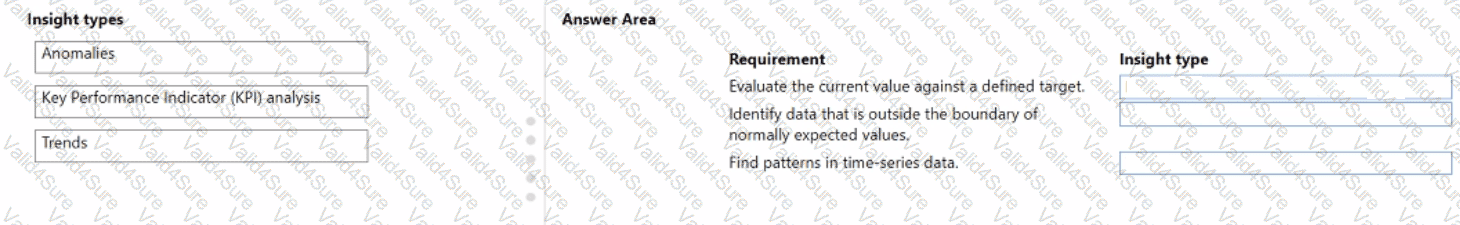 Which insight types should you select? To answer, drag the appropriate insight types to the correct requirements. Each insight type may be used once, more than once, or not at all. You may need to drag the split bar between panes or scroll to view content.