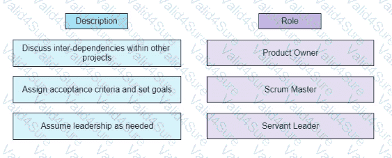 A new project manager for an agile project is reviewing with an established team, some of the roles to avoid confusion on what to expect. Drag the description on the left to the role on the right