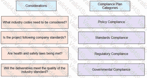 A project manager is leading a project in a heavily regulated industry. Match the considerations on the left with the correct compliance plan categories on the right.