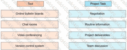 An agile team is geographically separated across multiple continents, and the project manager is in the process of identifying the tools to manage the communication among the virtual teams. Drag the appropriate tool on the left to each project task on the right.