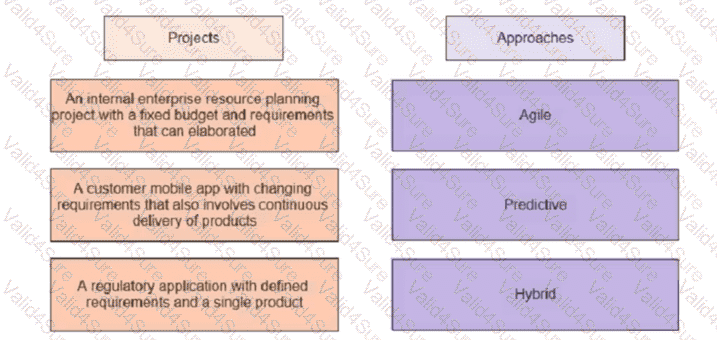 A project manager gas been asked by the project manager office (PMO) to select the appropriate project management approach for three upcoming projects. Match the projects on the left with the approach that should be used on the right.