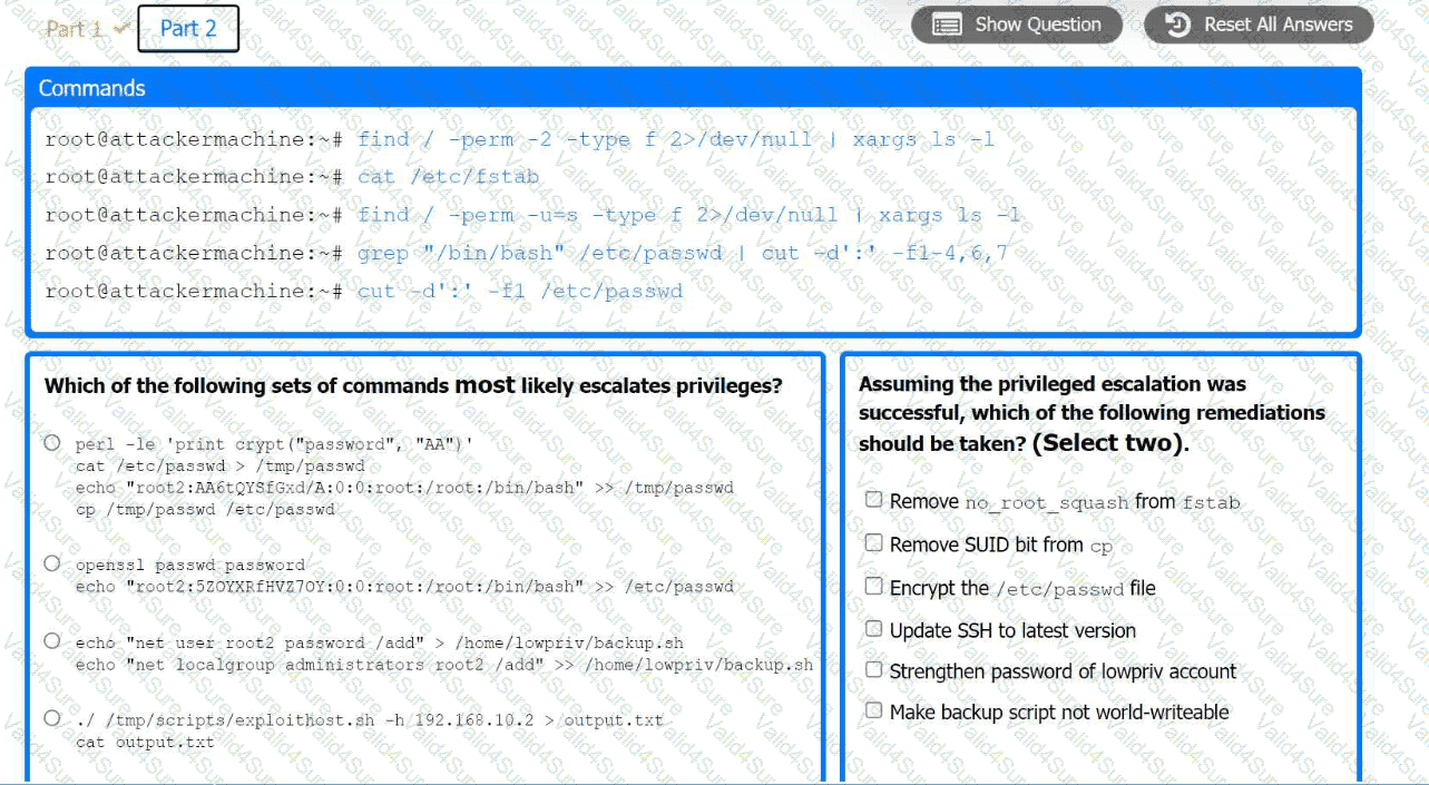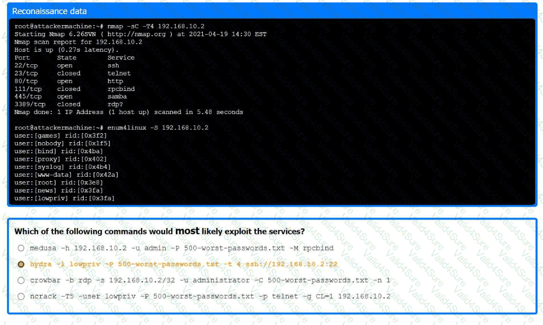 Which of the following attacks will most likely allow the penetration tester to escalate privileges?