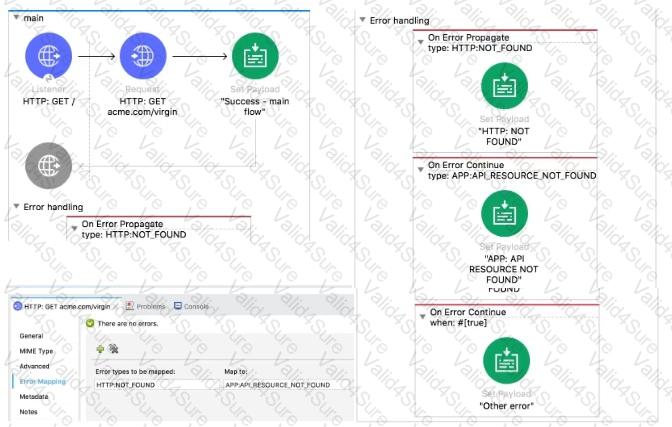 The main flow is configured with their error handlers. A web client submit a request to the HTTP Listener and the HTTP Request throws an HTTP:NOT_FOUND error.