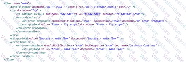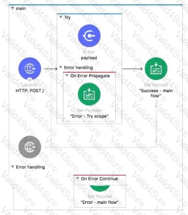 The Validation component in the Try scope throws an error. What response message is returned to a client request to the main flow's HTTP Listener?