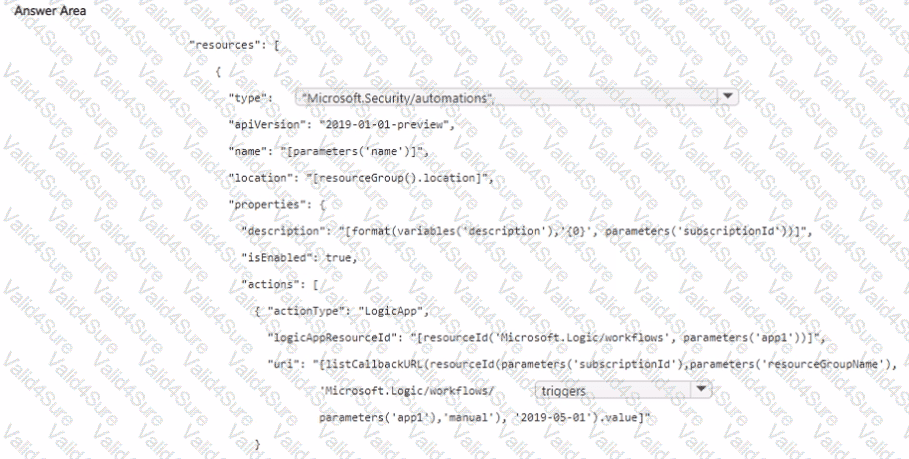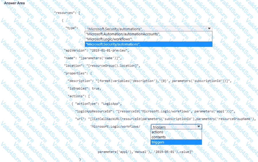 How should you complete the Azure Resource Manager (ARM) template? To answer, select the appropriate options in the answer area