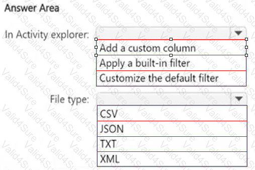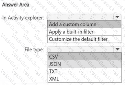 What should you do in Activity explorer before exporting the data, and in which file format is the file exported? To answer, select the appropriate options in the answer area.