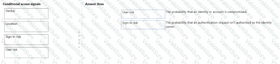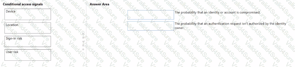 To answer, drag the appropriate Conditional Access signal type from the column on the left to its definition on the right. Each signal type may be used once, more than once, or not at all.