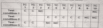 Assume that you are using traceability to manage test case coverage against test conditions. During test analysis, three test conditions were identified. Test design for system testing has been completed and 10 test cases (TC1 to TC10) have been designed, as described by the following traceability matrix (“C†indicates a critical test case, while “NC†indicates a non-critical test case):